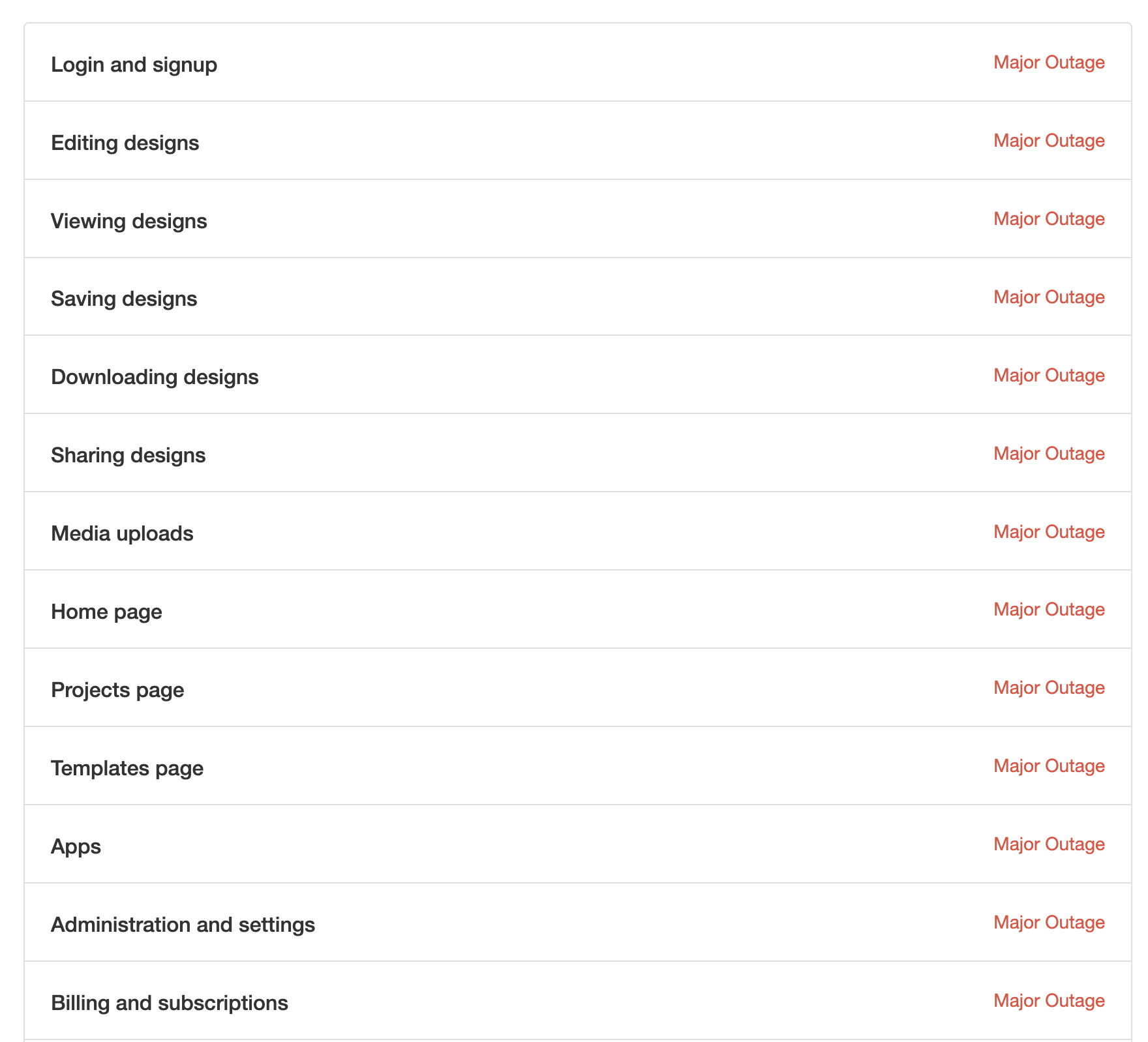 At 18:14 AEDT today, Canva's entire platform went offline. Every single feature—from login and design editing to mobile apps, API integrations, and even their educational LMS platforms—showed "Major Outage" status.